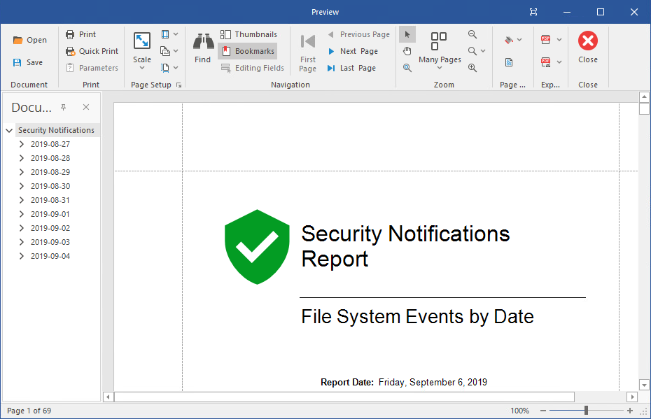 Reports are first generated in preview mode, where they can then be saved in a number of different format types.
