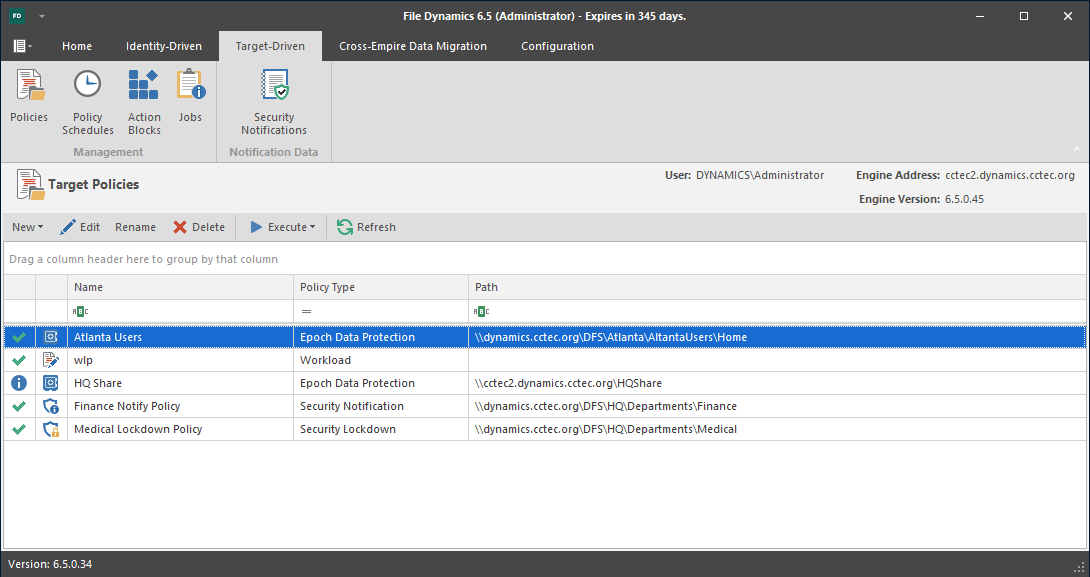 Right Pane: Depending on what is selected in the Left Pane, this region either lists specific Target-Driven policies, or displays the policy settings for a selected Target-Driven policy.