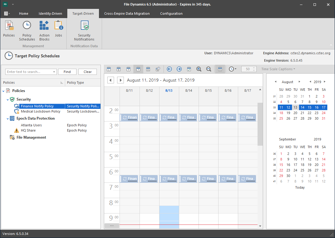 Left Pane: This region displays all Target-Driven policies according to classification. If you click a classification such as Groom, only scheduled Groom policies will be displayed on the calendar in the Middle Pane. If you click a named Target-Driven policy such as Main Groom Policy for Atlanta Users, the schedule for that policy appears in the calendar of the Middle Pane.