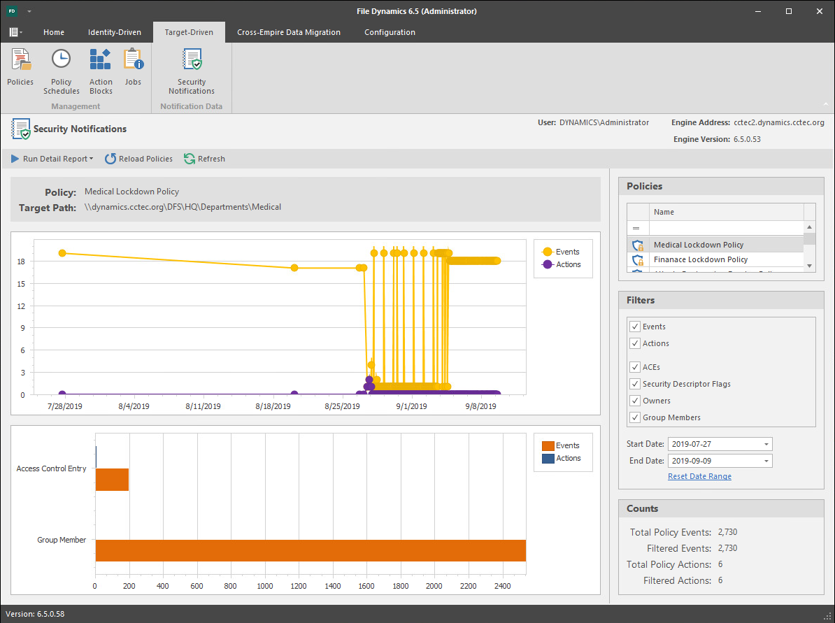This page provides a graphical summary of changes in security access permissions and group memberships for High-Value Targets managed through security policies. Using the information you ascertain from the graphs, you can in-turn run a Detail Report to view the details of the changes.