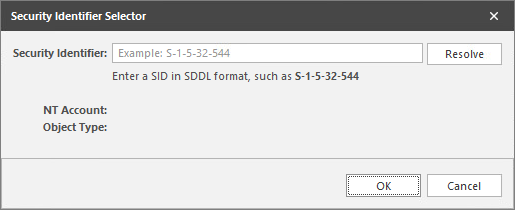 In the Security Identifier field of the Security Identifier Selector dialog box, enter the SID in SDDL format and click Resolve.