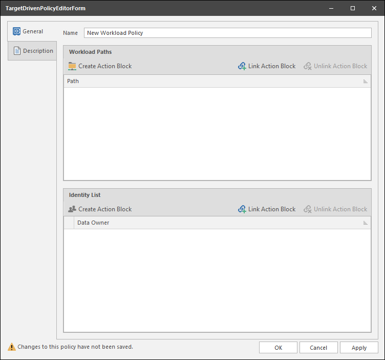 Workload Paths: This region displays the Workload path for this policy, as well as provides the means of linking, unlinking, and viewing Action Blocks pertaining to the path.