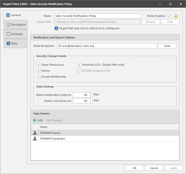 Security Notification policies let you specify the shares or folders to be analyzed, the frequency of this analysis through scheduled scans, and the administrators who are to be notified when changes in access permissions take place.