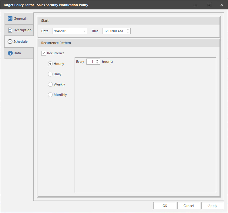 (Conditional) If you want the policy to run on a recurrent basis, select the Recurrence check box and then select one of the options.