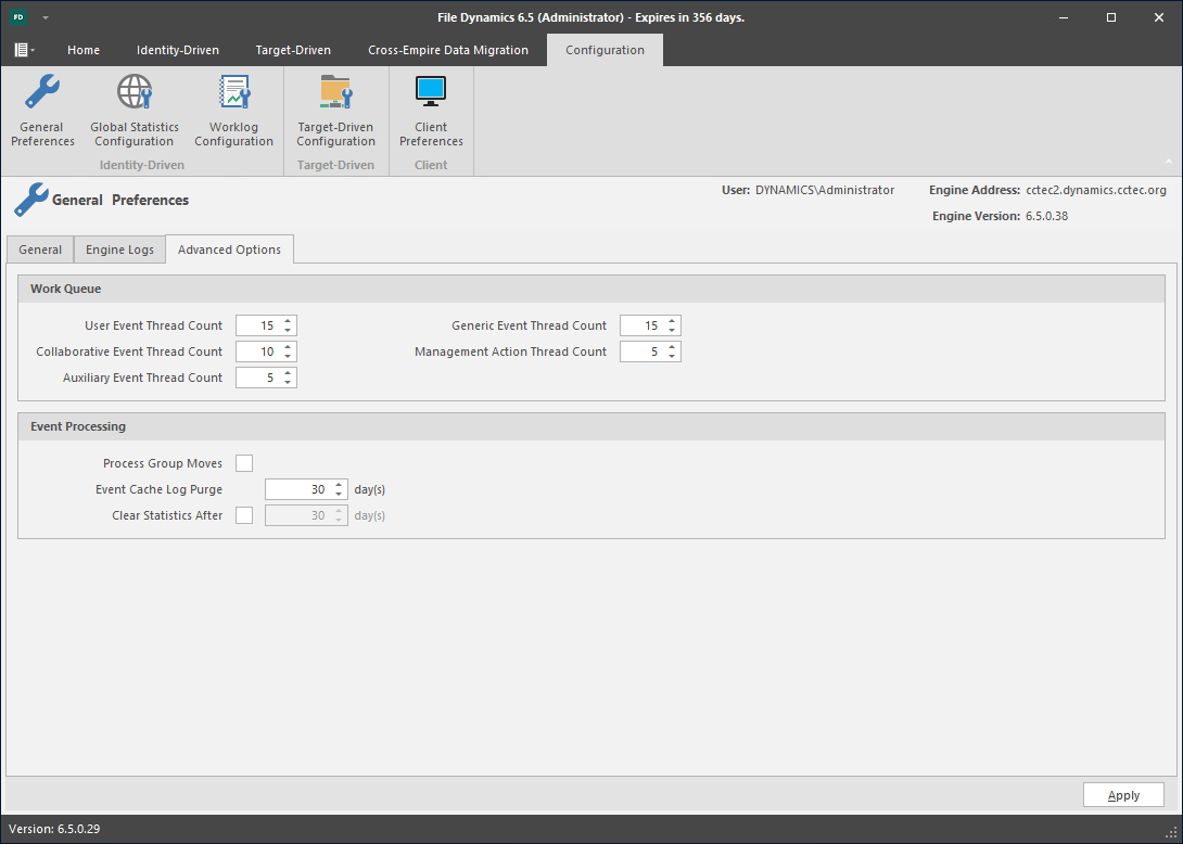 The Advanced Options tab lets you view or reconfigure the thread count settings allocated for the actions that File Dynamics performs.