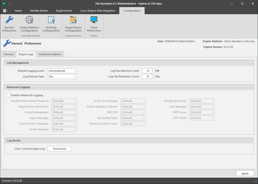 The Engine Logs tab includes settings specific to log files. Log files are accessible only from the server hosting the Engine at C:\ProgramData\Micro Focus\File Dynamics\Engine\log.