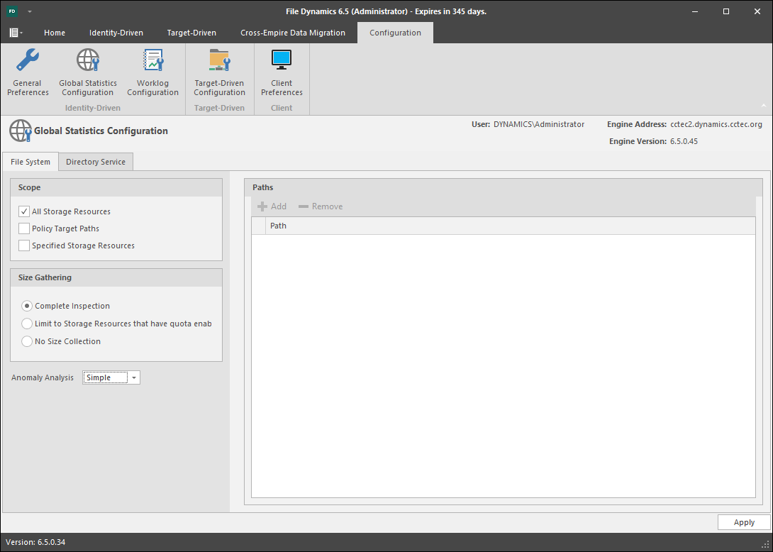 This configuration will cause the GSR Collector to skip enumeration of all shares found in Storage Resources for size related data. If Global Statistics are not needed on a regular basis or you have a need for finer granularity in your historical data, this option may be best suited for your goals. However, if you choose this option, there will be no size data to drive Global Statistics and Policy-based Path Redistribution.