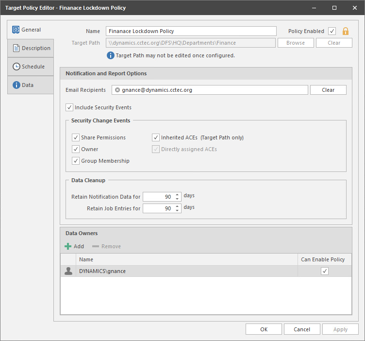 (Conditional) If the currently established access permissions to the specified High-Value Target are the permissions you want enforced, select the Policy Enabled check box.