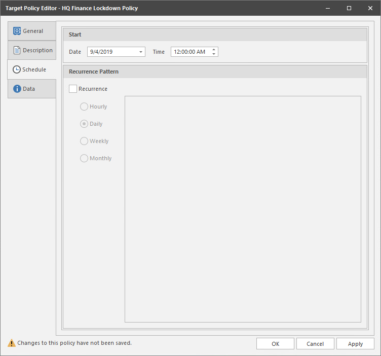(Conditional) If you want the policy to run on a recurrent basis, select the Recurrence check box and then select one of the options.
