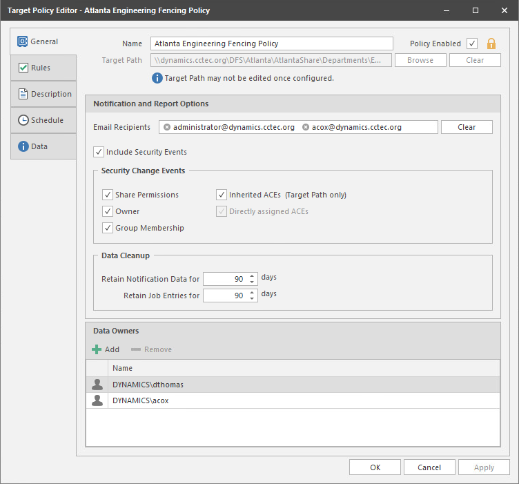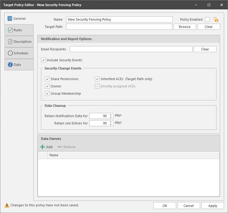 Data Owners assigned for a Security Fencing Policy will be enabled to view permitted changes in security, ownership, and group membership of folders in the High-Value Target via the Data Owner Client.