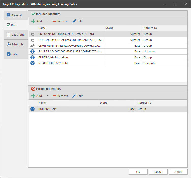 In the Included Identities and Excluded Identities regions, use the Add drop-down buttons to include and exclude groups, users, and SIDs for this Fencing policy.