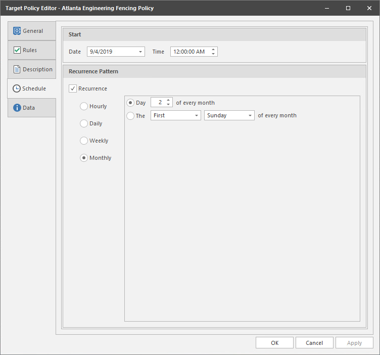 (Conditional) If you want the policy to run on a recurrent basis, select the Recurrence check box and then select one of the options.