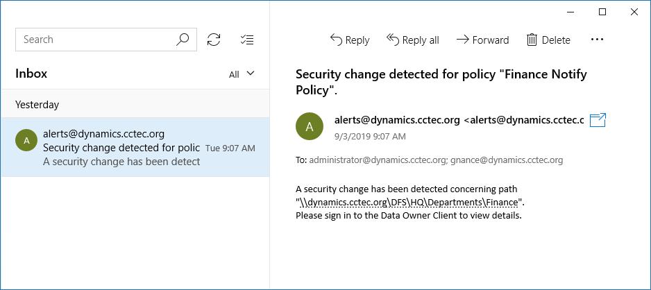 The target path for the selected Security policy is scanned for security changes. If changes are determined, an email is sent to the users specified in the Email Recipients field of the policy.