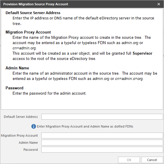 Admin Name: Specify the typeless FDN of an account in the source eDirectory tree that has the appropriate right to provision the Migration Proxy Account (MPA).