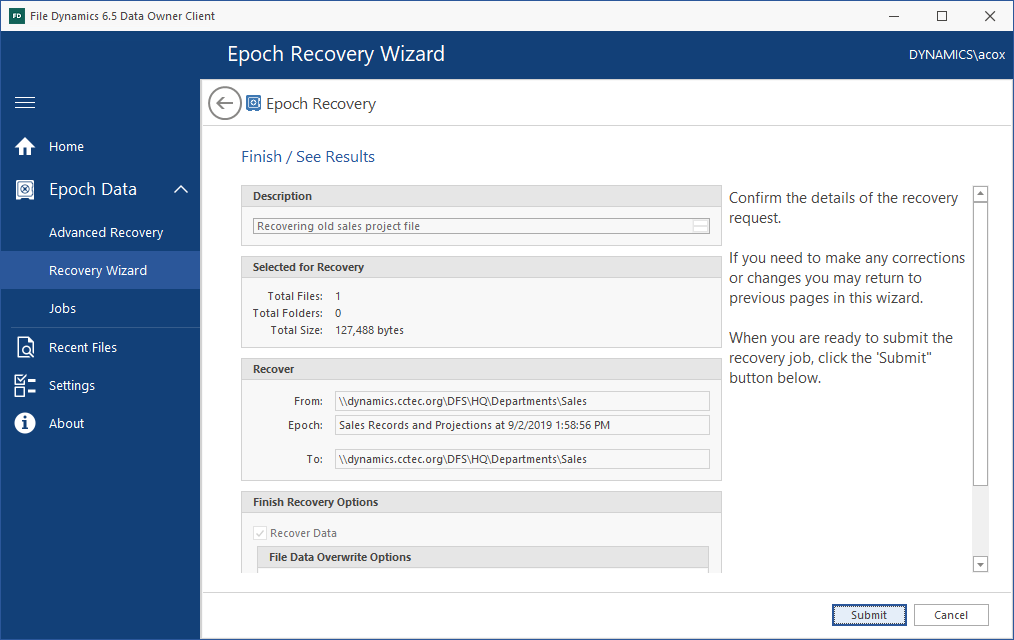 In the Recovery Options region of the wizard page, specify whether to overwrite data or not, whether to overwrite or merge permissions, and whether to recover the original file ownership settings.