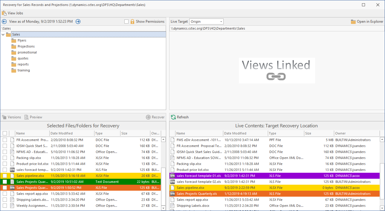 Show Permissions: When selected, this specifies all users and groups that have permissions to a selected folder from the Epoch, and what those specific permissions are. This information is useful to have before you recover a folder because when you do so, you can specify to keep the existing permissions or to overwrite them with the permissions (including inherited) that exist in the live network.