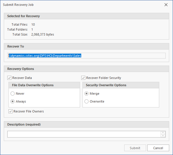 Specify your recovery options in the Submit for Recovery Job dialog box and click Submit.