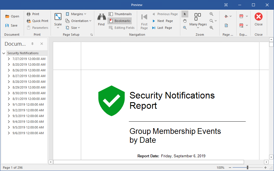 The report is generated in preview mode where it can be printed or saved into a variety of formats.