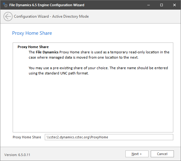 The Proxy Home Share that you establish in this page is the read-only location where users’ managed path attributes are temporarily set when data is moved because of a change in policy.
