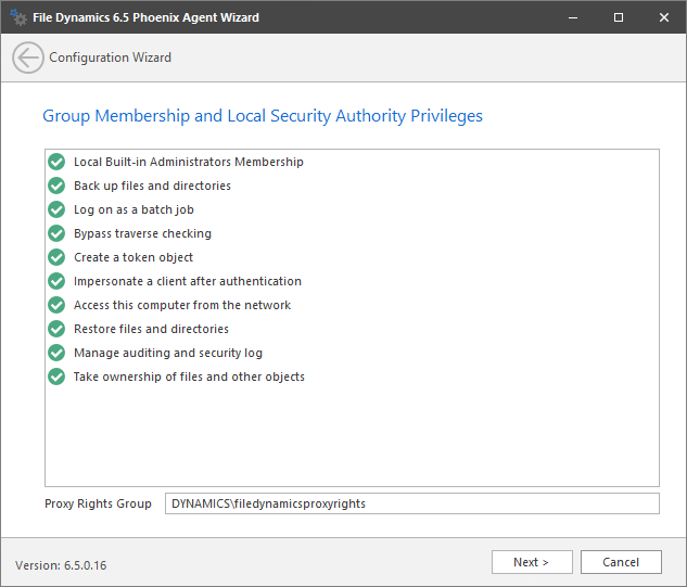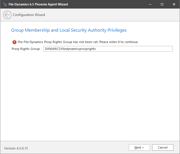 (Conditional) If you chose a name that was not the default name for the File Dynamics Proxy Rights group, enter the name in the Proxy Rights Group field.