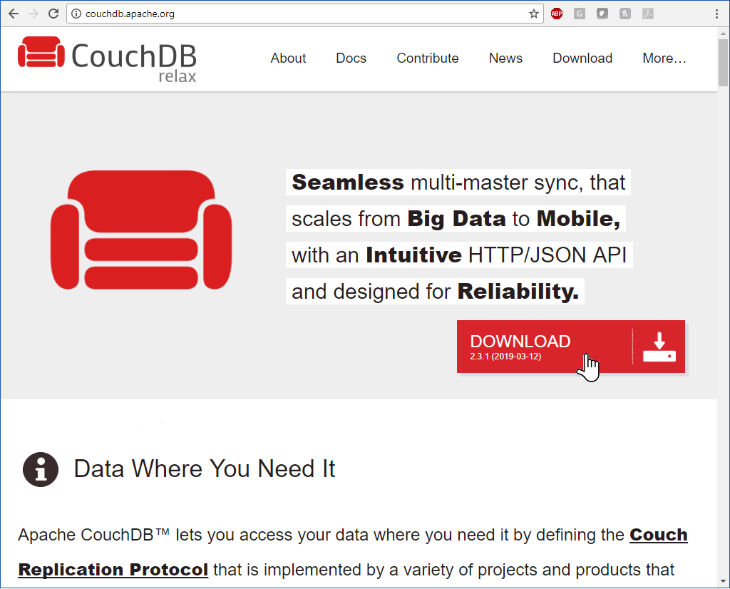 From couchdb.apache.org, download the platform version of CouchDB 2.3.1 for the server that will host the CouchDB database.