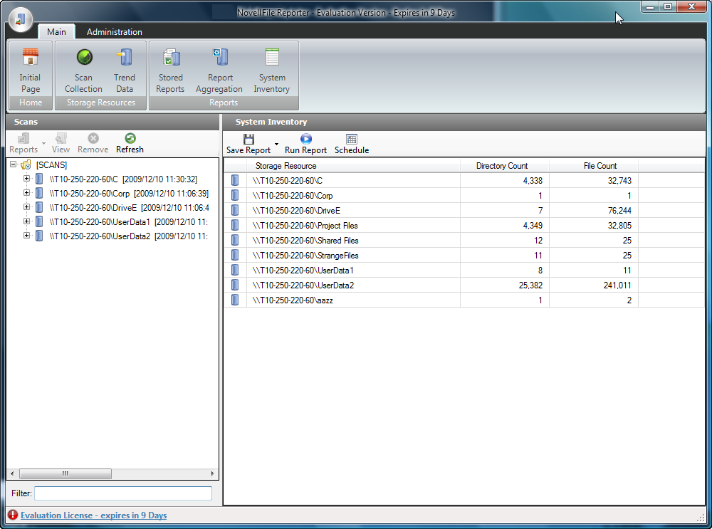 The system inventory data appears in the Storage Resource, Directory Count, and File Count columns.