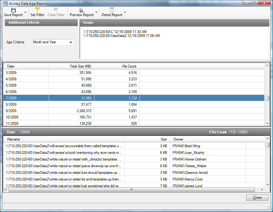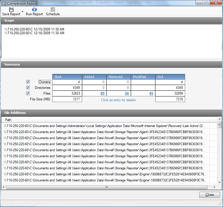 Novell File Reporter allows you to create “multi-scope reports,” which are reports generated from two or more scans. The first type of multi-scope report is a Comparison Report that uses two scans of the same storage resource to compare two points in time. The other is an aggregate of two or more scans from different storage resources to give you a broad report, such as for all volumes on a server, or all volumes across the network.
