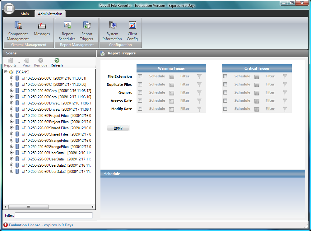 Novell File Reporter has two capacity parameters that it monitors for triggered reports. These are Warning and Critical, which by default are set at 75% and 85% respectively, but they can be modified to your preferences.