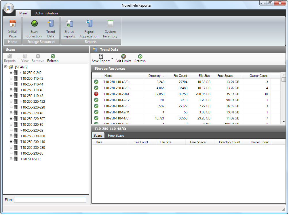 With the displayed data, you can now determine trends in increasing file count or decreasing free space by comparing the data between the scans.