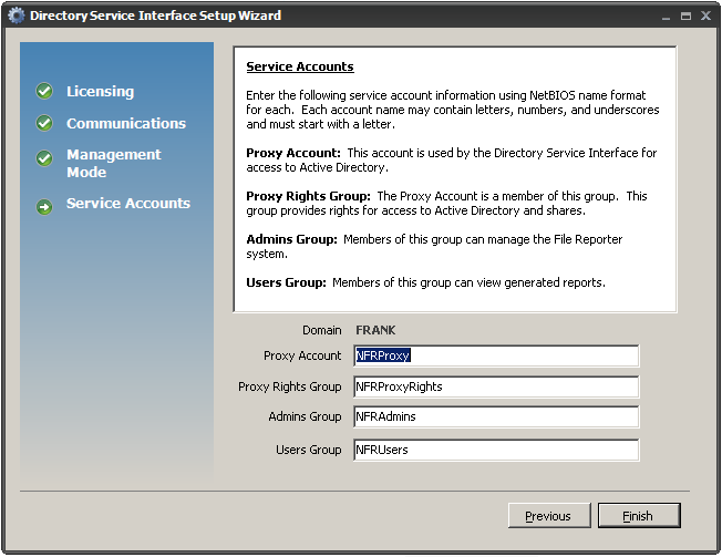 If you have an admin group in Active Directory, and you want administrative rights to be assigned to the group within Novell File Reporter, indicate the name of the existing group in the field.