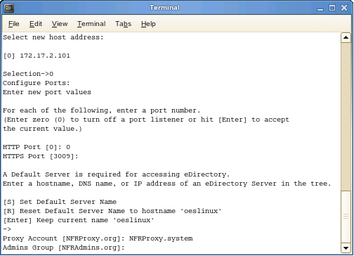 When you are prompted for the NFRUsers name, enter NFRUsers.container_name, or if you have an eDirectory group whose members will have partial administrative rights, specify the name of that group followed by the container name, and press Enter.
