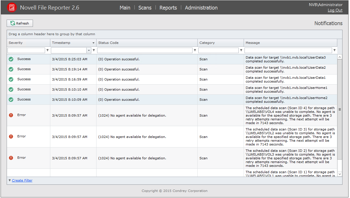 Novell File Reporter displays notifications for successfully completed scans, failed scans, completed reports, failed reports, errors, warnings, and other information. You can use the filtering options to list only the notification types you want.