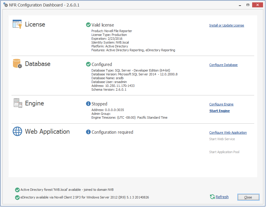 This page lets you establish the settings needed for the NFR Engine and IIS to communicate with the database.