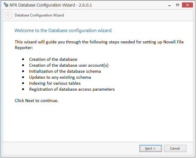 The page indicates what database configuration tasks are to be completed in this wizard.