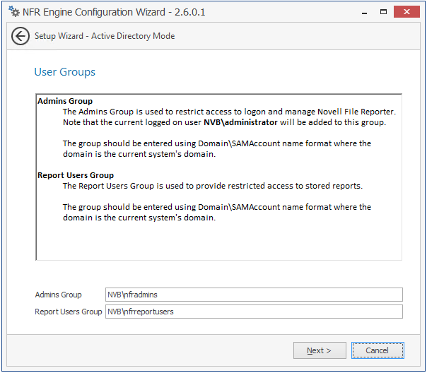 Specify the name for the Admins Group and Report Users Group, or use the default names.
