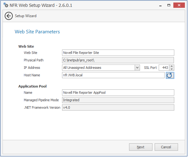 Web Site: The default name for the Novell File Reporter Web site. If the default name does not conform to your organization’s naming standards, you can edit it.