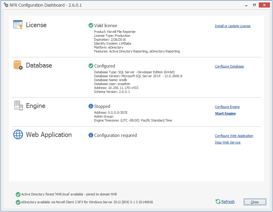 The page lets you establish the settings needed for the NFR Engine and IIS to communicate with the database.