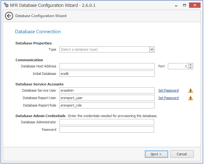 Database Service Accounts: Use this region to set authentication information for the Database Service User and Database Report User.
