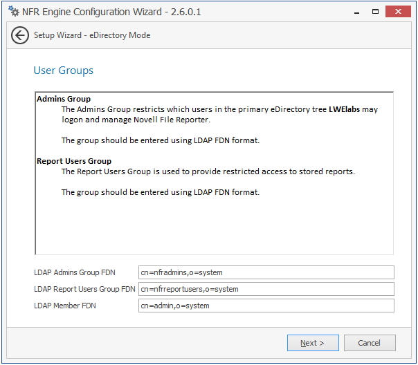 LDAP Admins Group FDN: Based on your organizational structure, modify the path for an admins group that Novell File Reporter will create with LDAP fully distinguished naming.