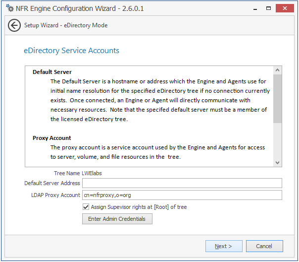 Specify the default server address, LDAP proxy account, and eDirectory LDAP credentials and click Next.
