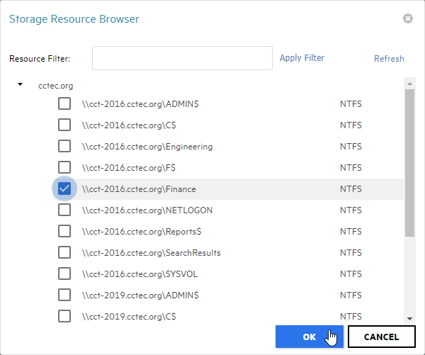 If you do not see a file share you are looking for, you might need to perform a Rebuild Storage Resources operation or verify File Reporter proxy user rights. For details, refer to the Micro Focus File Reporter 3.6 Administration Guide.