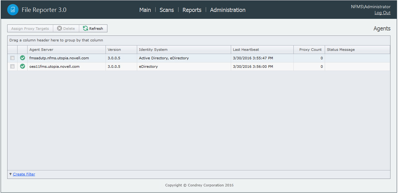 File Reporter does not include a NetWare Agent. Furthermore, an Agent cannot be deployed on a NAS device or server cluster. Finally, some organizations might not want Agents deployed on every server. In situations such as these, you can have a deployed Agent on another server function as a proxy agent.