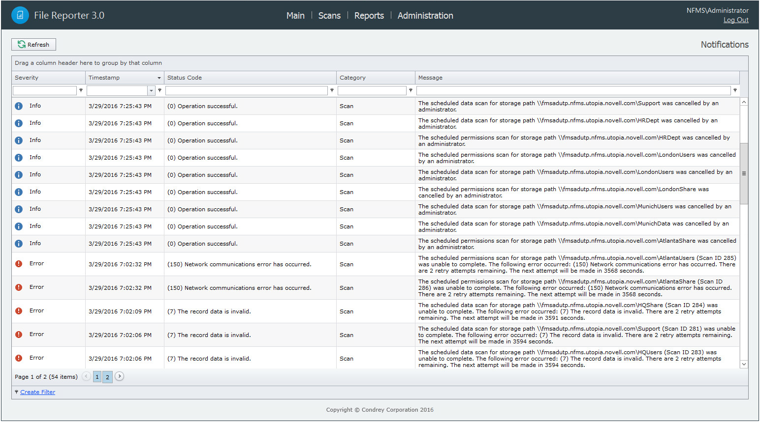 File Reporter displays notifications for successfully completed scans, failed scans, completed reports, failed reports, errors, warnings, and other information. You can use the filtering options to list only the notification types you want.