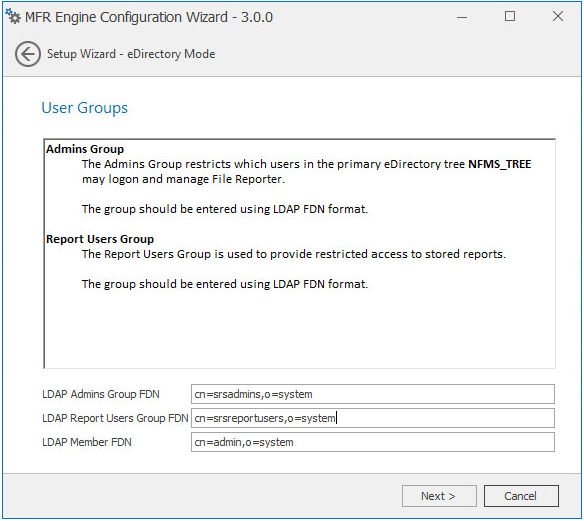 LDAP Admins Group FDN: Based on your organizational structure, modify the path for an admins group that File Reporter will create with LDAP fully distinguished naming.