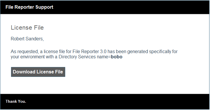 An email from File Reporter Support is automatically sent to you with an embedded link for accessing the license.