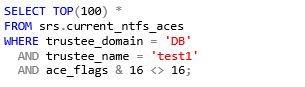 Example: Select all folders where a user is a direct trustee (not inherited) for NTFS, limited to 100 entries.