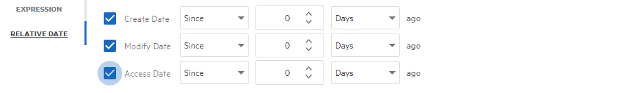 Click Relative Date and then select the Create Date, Modify Date, and Access Date check boxes to enable the corresponding drop-down menus and fields.