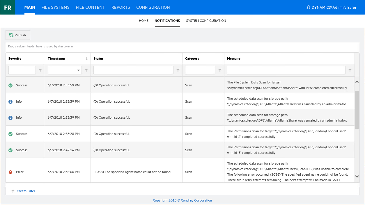 File Reporter displays notifications for successfully completed scans, failed scans, completed reports, failed reports, errors, warnings, and other information. You can use the filtering options to list only the notification types you want.