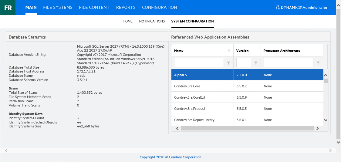 The Main menu provides access to notifications and system information. The File Systems menu is the means to setting up and viewing the progress of file system scans. The File Content menu provides options for setting up and conducting file content scans. The Reports menu is the means of generating and accessing reports. The Configuration menu is the means of establishing and modifying configuration settings within File Reporter.