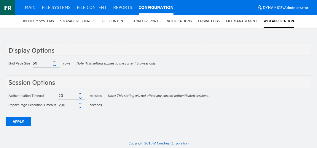 After 20 minutes of inactivity in the administrative interface, you are required to log in again. You can adjust this setting and specify the number of items displayed per page through the Web Application option of the Configuration menu.
